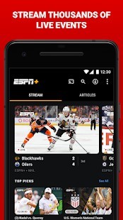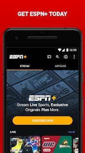 Sign up for ESPN+ and get access to the streaming service that delivers live sports from the best leagues in the world plus premium articles and fantasy tools. Get live events from the UFC, MLS, NHL, international soccer, college sports, and more. Enjoy the complete 30 for 30 library and exclusive ESPN+ Original shows from the biggest names in sports including Peyton Manning, Dana White, Kevin Durant, Alex Morgan, and more all inside the ESPN app.